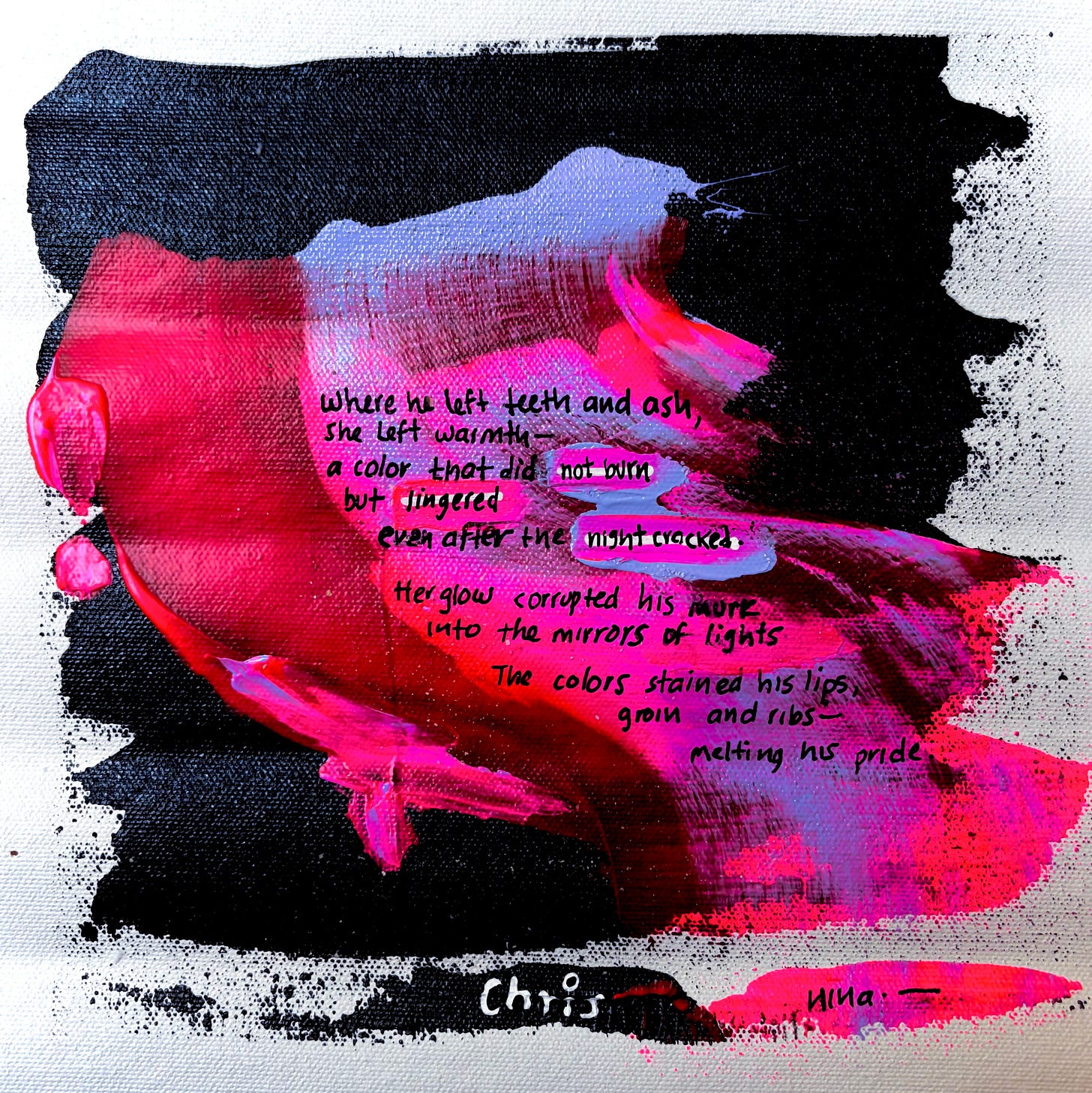 After the Night CrackedSomething short, pretty and soft.Night Cracks and ninaMar 02, 2026372711ShareWhere he left teeth and ash,she left warmth—a color that did not burn,but lingeredeven after the night cracked.Her glow corrupted his murkinto the mirror of lights.The colors stained his lips,groin and ribs—melting his pride.